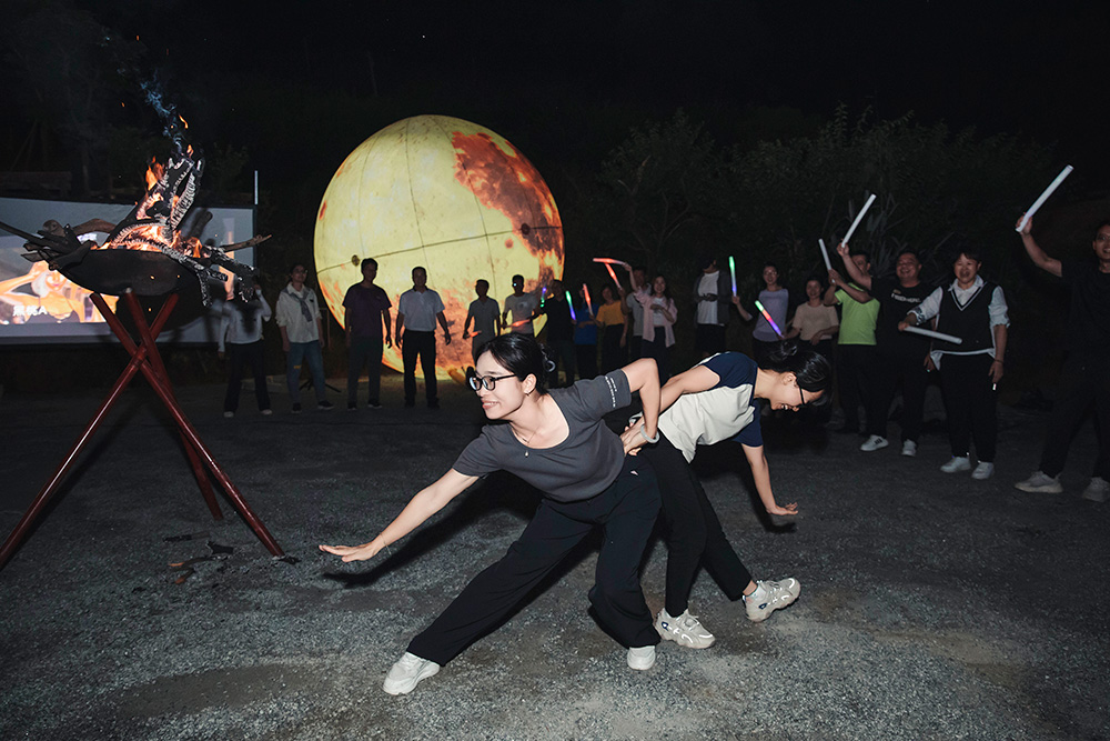 動(dòng)力圈——一根柔軟的棉繩要在所有人的配合下幻化成一個(gè)鋼圈,并要完成50~100次的快速螺旋圈旋轉(zhuǎn)——你能相信嗎?我相信了,因?yàn)槲覀冋娴淖龅搅耍?/span>