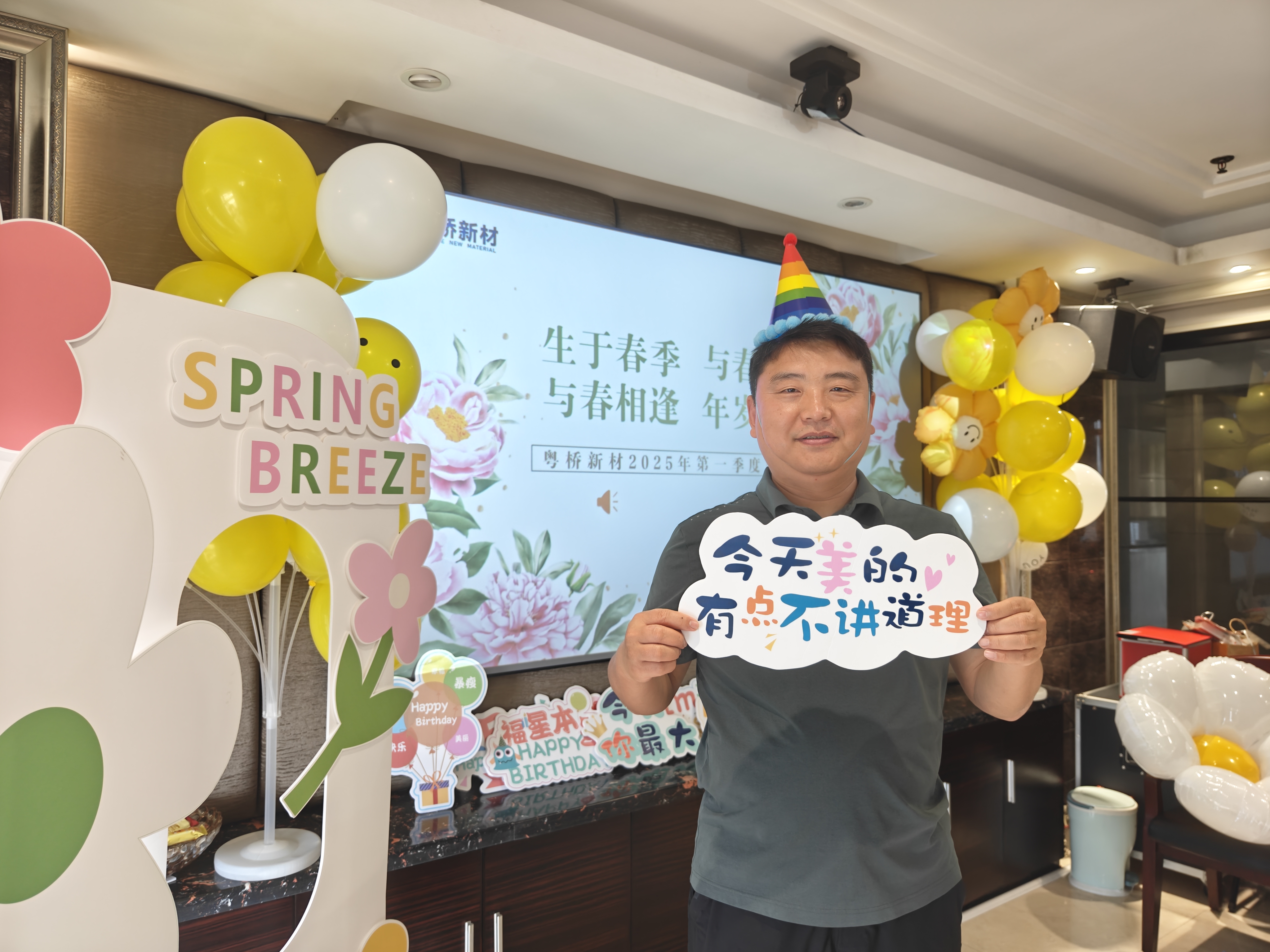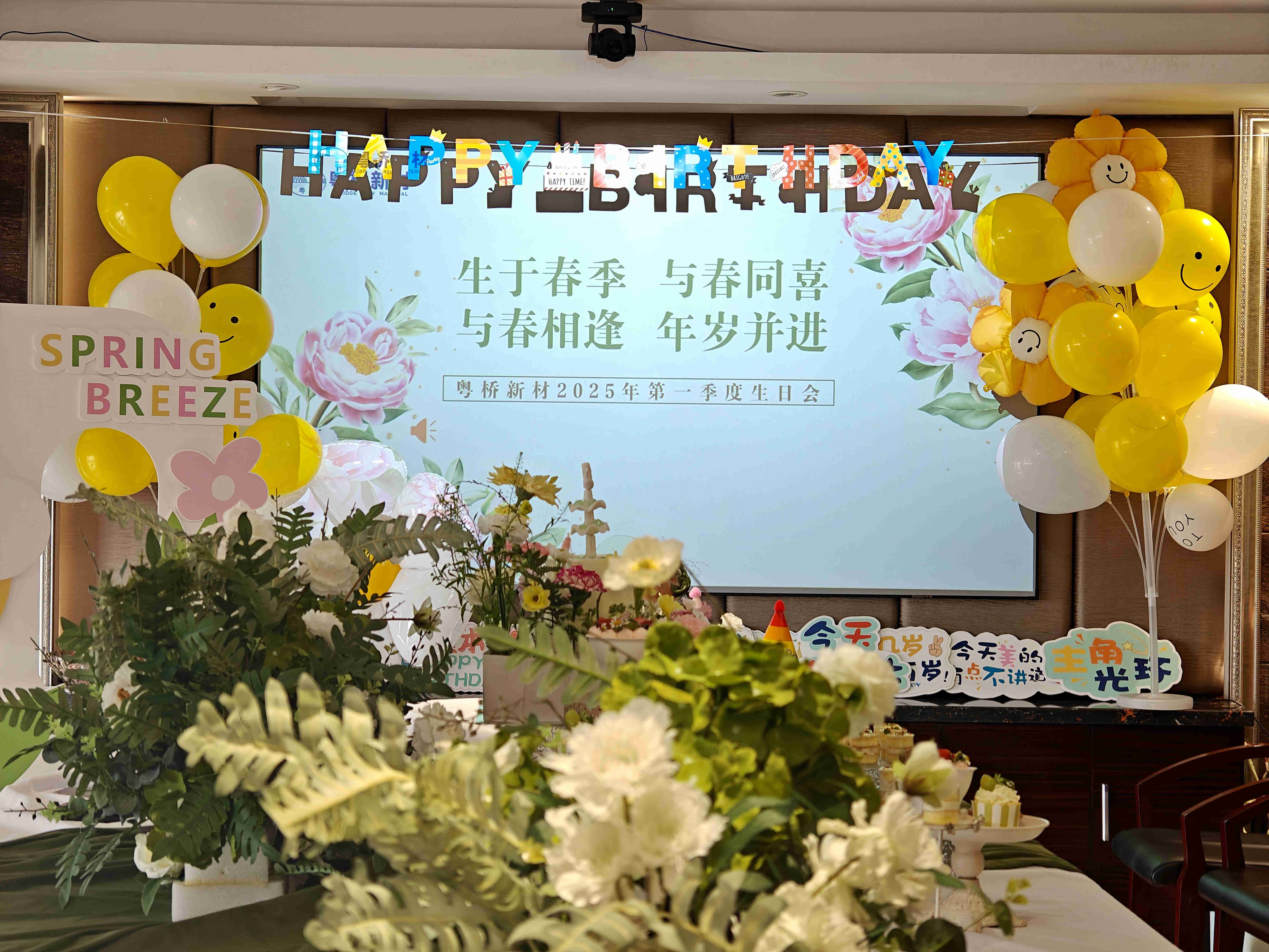 3月14日,粵橋新材總部22樓會(huì)議室化為一方春意盎然的天地,迎來(lái)了2025年第一季度員工生日會(huì)。生日會(huì)“以春之名,共赴一場(chǎng)花事”為主題,將春天的詩(shī)意與生命的禮贊完美融合,為16位本季度壽星編織了一段春日里的溫馨記憶。