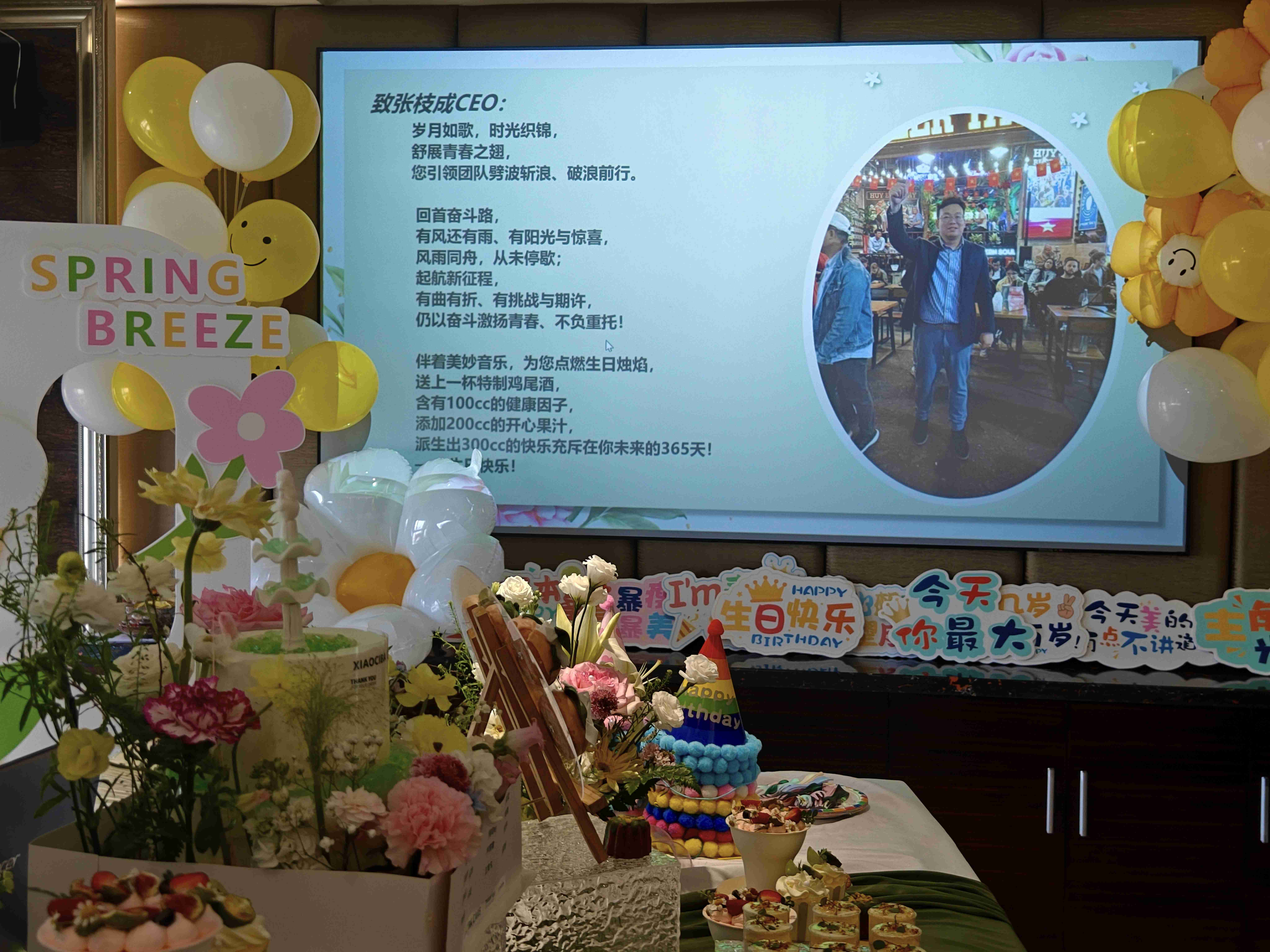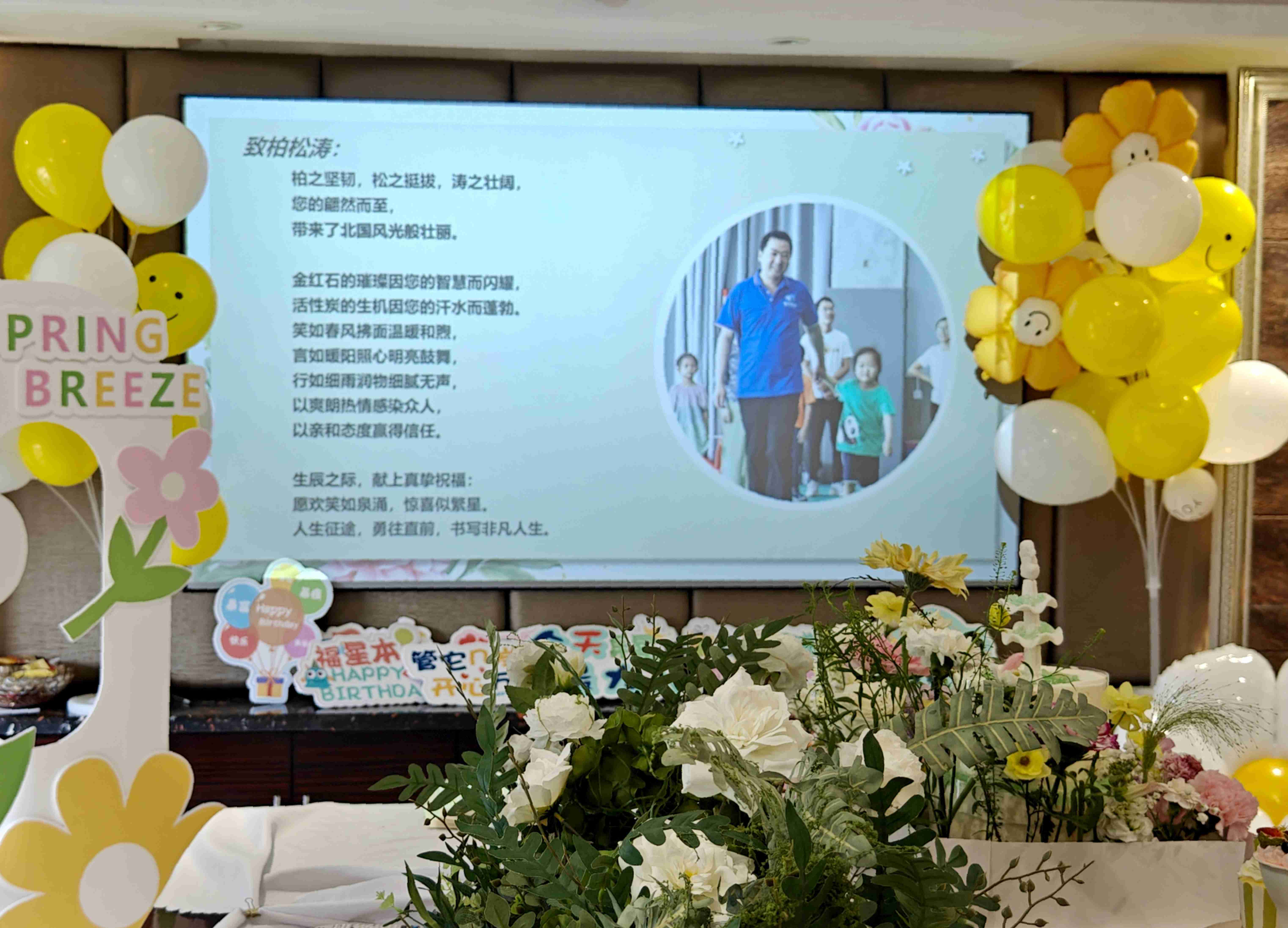 隨著大屏幕的緩緩滾動(dòng),壽星們的翩翩倩影定格成幀,再精注一首專(zhuān)屬于本人的美好祝福語(yǔ),字里行間描述出您在平凡崗位上盡職盡責(zé)的美麗瞬間,和與眾不同的風(fēng)采與個(gè)性,以及來(lái)自公司領(lǐng)導(dǎo)對(duì)您的親切問(wèn)候和溫馨祝福,種種如是似春日般的溫暖遍布全身。